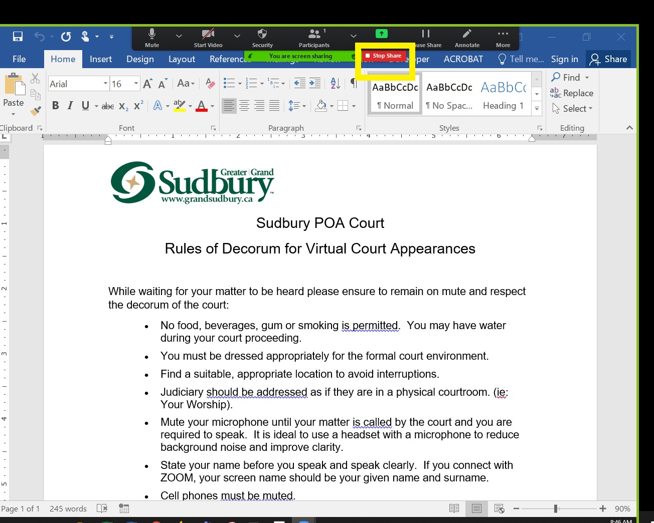 Lorsque vient le temps d'afficher le document à l'écran pendant l'audience, veuillez indiquer à la greffière ou au greffier lequel des documents il faut afficher. Si vous n'êtes pas en mesure d'envoyer votre ou vos documents par courriel avant la date prévue pour l'audience, veuillez communiquer avec le Bureau des infractions provinciales et parler à la greffière ou au greffier du tribunal, ou à l'agente ou à l'agent d'enregistrement judiciaire afin de prendre d'autres dispositions à cette fin.