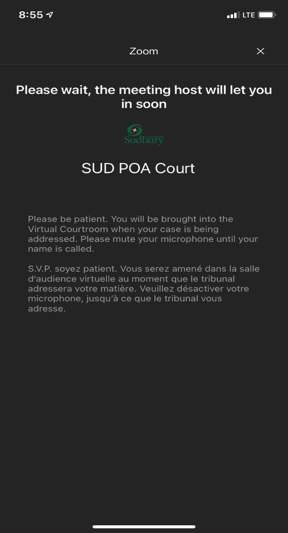 Une fois que vous aurez entré tous les renseignements demandés pour la comparution devant la cour, on vous mettra dans la salle d’attente jusqu’à ce que la greffière ou le greffier déclare l’audience ouverte. Si vous comparaissez par vidéoconférence, vous verrez la page suivante pendant que vous attendez que débute l’audience: