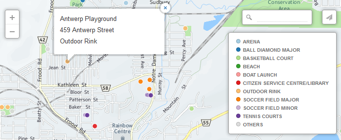 La carte utilise des données statiques sur les emplacements, ce qui vous permet de faire un zoom avant ou arrière ou un survol panoramique, de manière à vous donner rapidement une bonne idée de l’emplacement des diverses installations de loisir partout dans la ville.