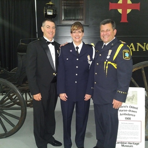Paul Kadwell, sous-chef adjoint des Services paramédicaux, Lorraine Bélanger, ambulancière paramédicale en soins avancés, et Darren Grace, surintendant d’équipe, reçoivent leur prix pour services méritoires et distingués lors d’une cérémonie tenue par l’Ontario Association of Paramedic Chiefs .