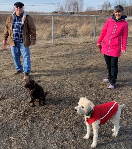 Deb McIntosh, conseillère du quartier 9 et Dan Skwarok, président du York K9 Club, en compagnie de Stella (à droite) et de Keeghan (à gauche)