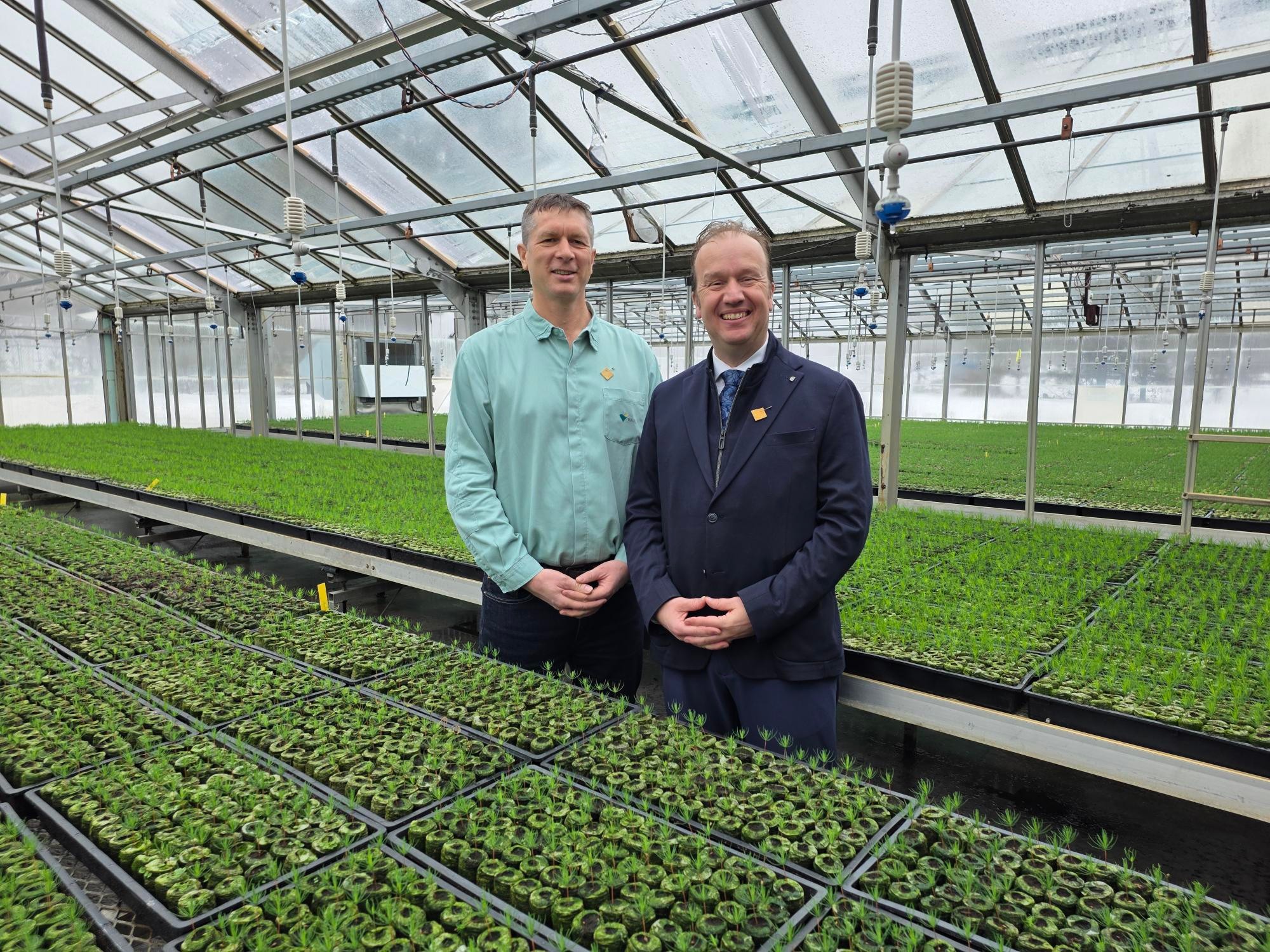 Paul Lefebvre, maire de la Ville du Grand Sudbury, et Gord Gilpin, directeur des opérations ontariennes de Vale Base Metals, à la serre de Copper Cliff, célèbrent l’accord de financement de la nature et la collaboration que cet accord représente.