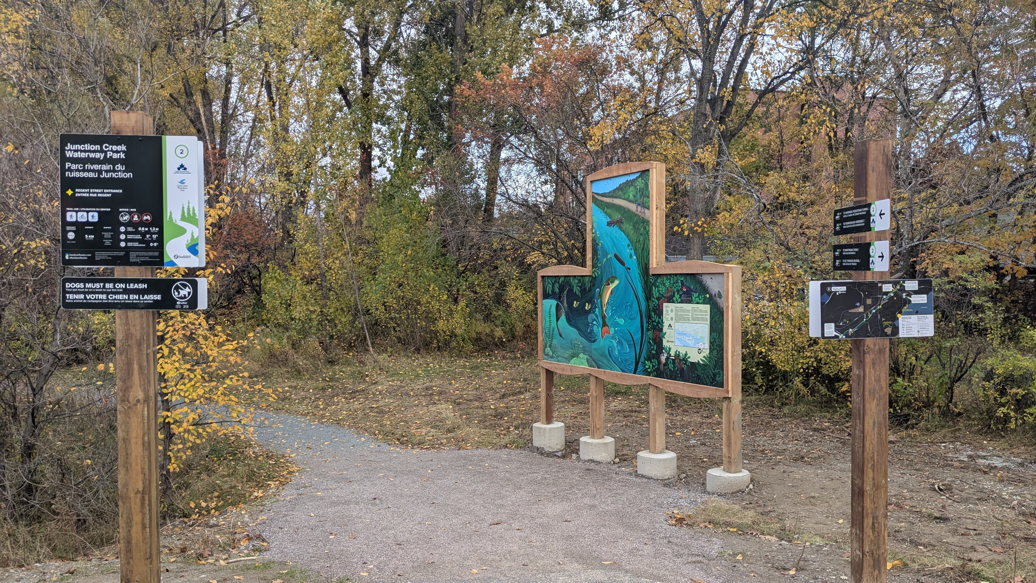 Description: Installation d’une enseigne d’orientation et d’information sur le sentier du ruisseau Junction, près de la rue Regent