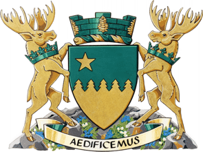 Les deux supports de chaque côté de l'écu représentent un orignal nordique aux colliers originaux. L'orignal est un symbole unique et puissant du Nord