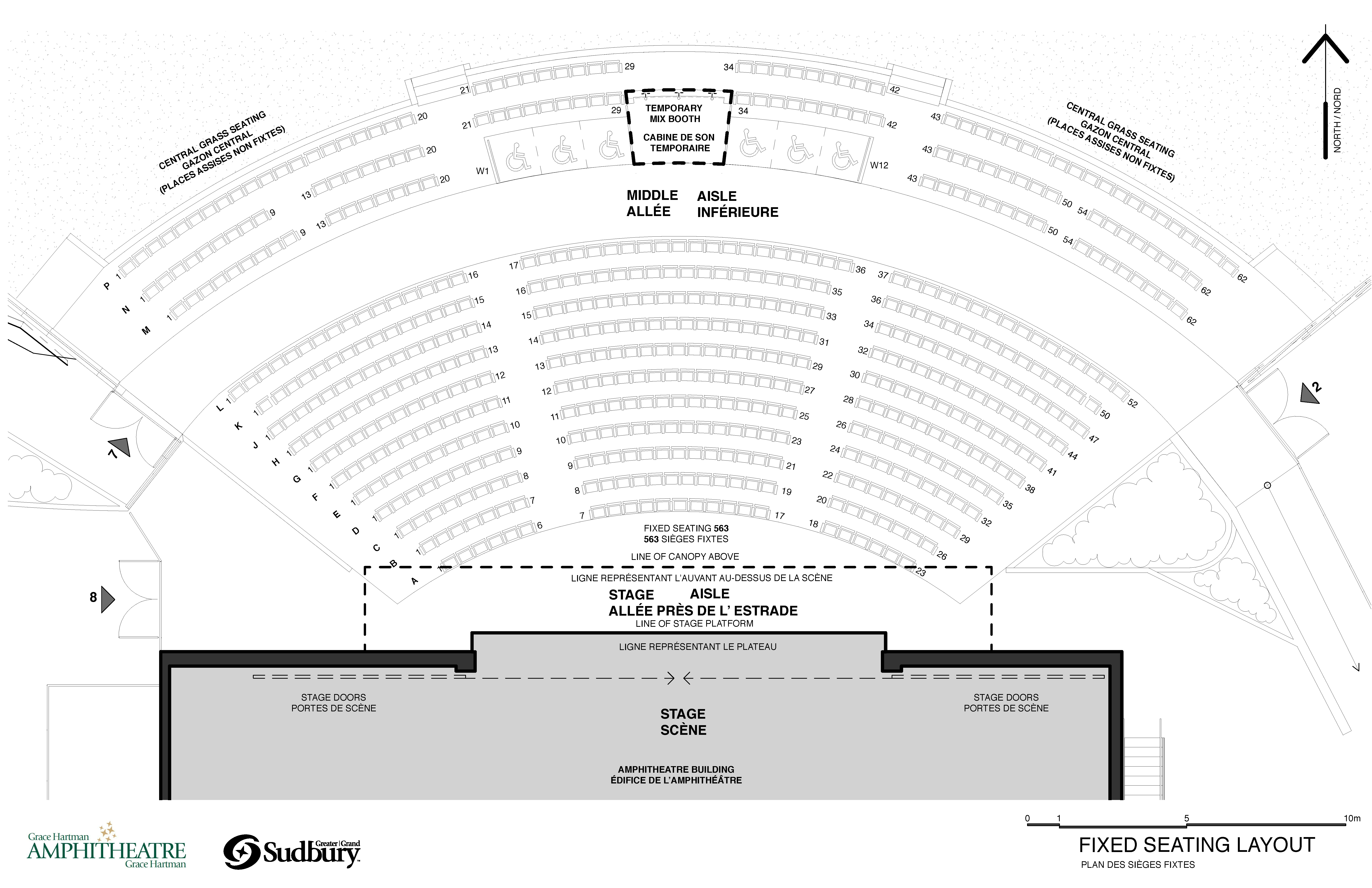 La capacité de l'amphithéâtre est de 1 963 personnes. Il comprend des sièges fixes pour 563 personnes, des sièges sur gazon pour 1 400 ainsi que des sièges accessibles.