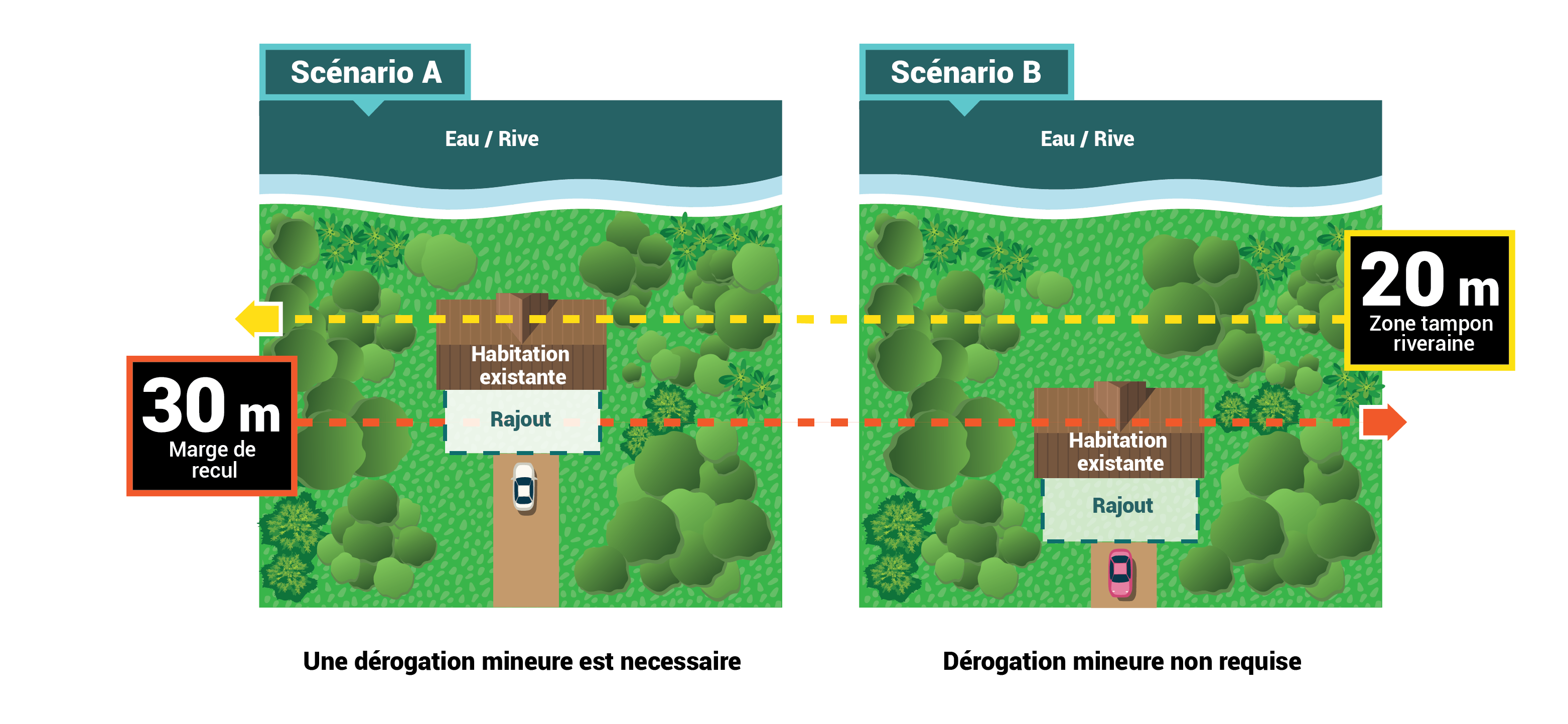 Le règlement municipal de zonage contient des dispositions qui permettent la réfection, l’agrandissement, la réparation et la rénovation. Dans certains cas, une dérogation mineure pourrait être exigée et dans d’autres, non. Si votre camp ou votre habitation est situé à l'intérieur de la marge de recul requise ET que l'ajout est partiellement ou entièrement situé à l'intérieur de la marge de recul, une dérogation mineure sera nécessaire. Les propositions seront évaluées au cas par cas par le personnel, et la recommandation d'approbation peut dépendre des caractéristiques du site, telles que la taille et la disposition (par exemple, un terrain de forme irrégulière), l'existence de contraintes empêchant la construction en conformité avec le règlement de zonage, etc.