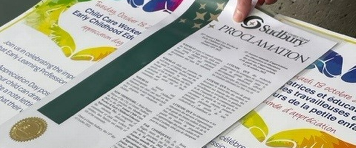 Le maire du Grand Sudbury a fait une proclamation officielle. « La Journée d’appréciation de cette année est tout particulièrement importante, alors que nous œuvrons à l’établissement d’un système pancanadien d’apprentissage et de garde des jeunes enfants qui favorisera la qualité, l’accessibilité, l’abordabilité et l’inclusion dans les garderies et les centres de la petite enfance, a expliqué le maire du Grand Sudbury. Le 18 octobre, j’encourage tout un chacun à reconnaître l’important travail qu’accomplissent les éducatrices et éducateurs et les travailleuses et travailleurs de la petite enfance et la grande différence qu’ils font dans l’apprentissage de nos enfants. »