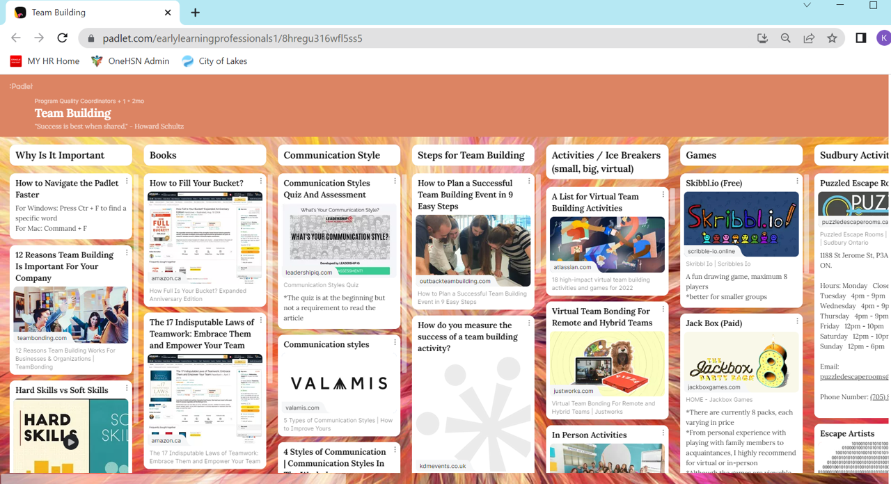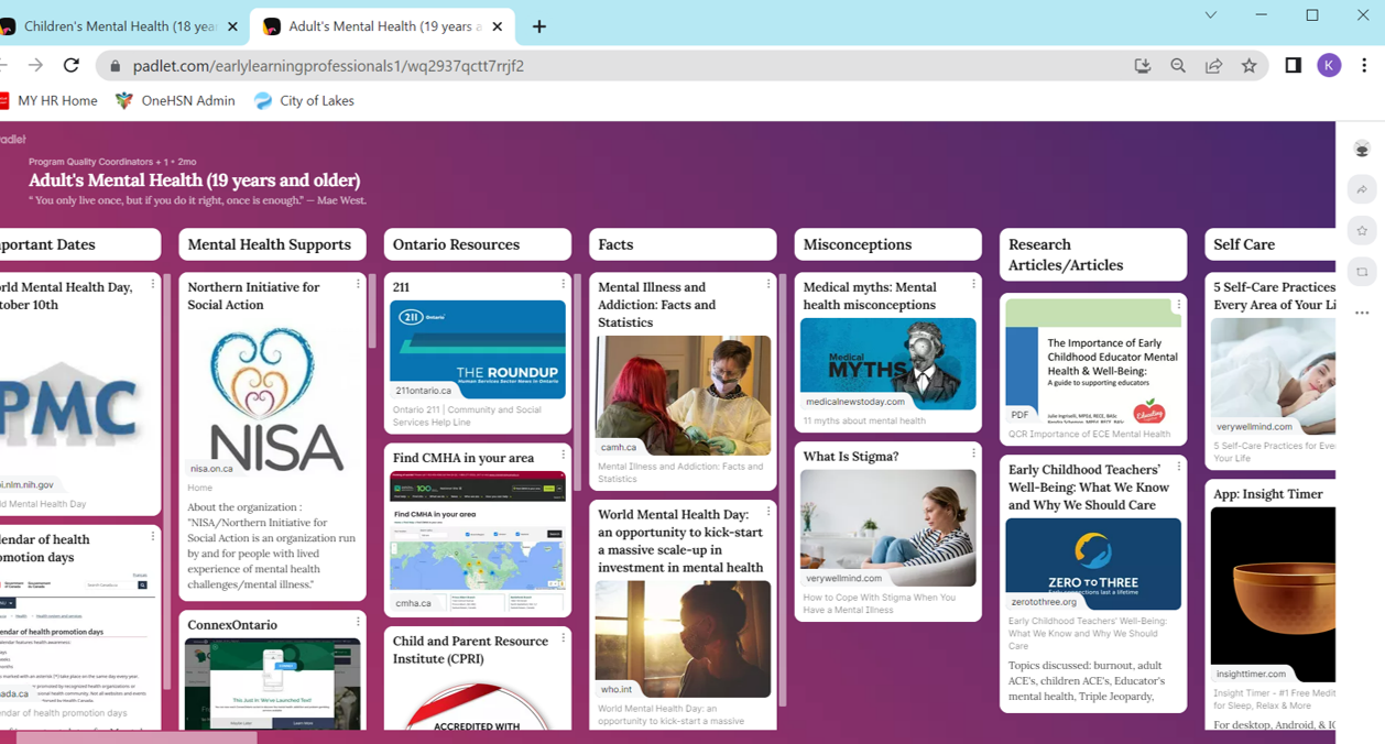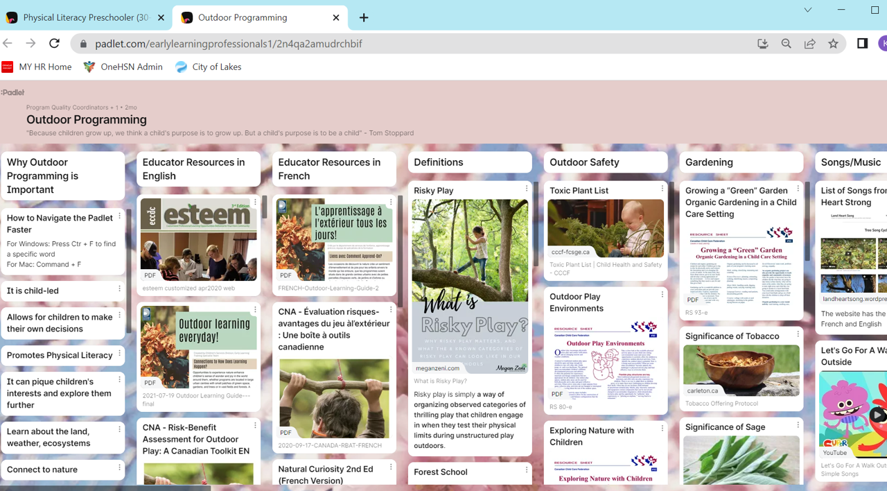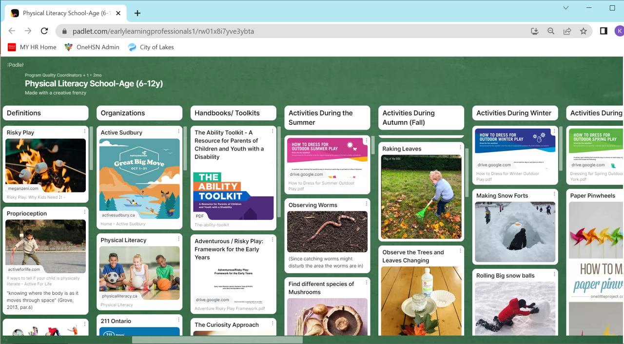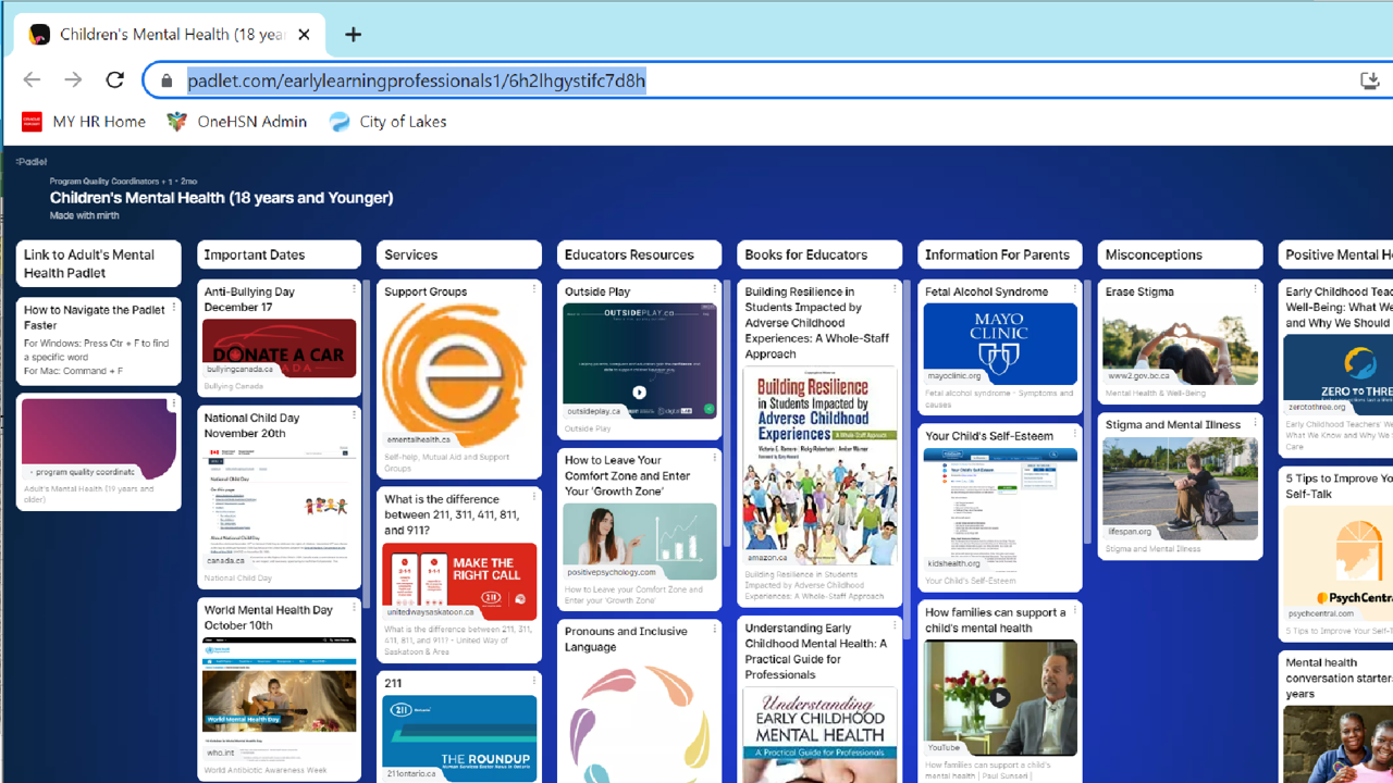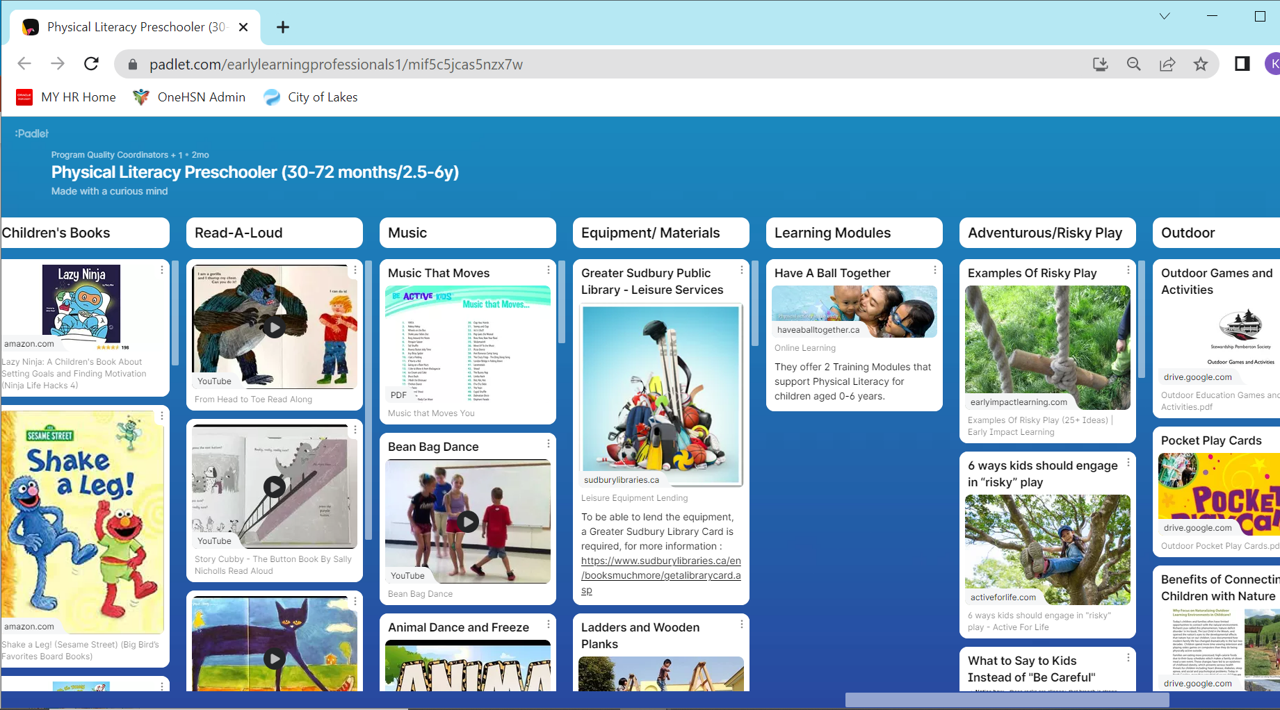 Ces ressources en ligne en anglais destinées aux éducateurs ont été créées pour le Grand Sudbury par un stagiaire de l'École de la petite enfance du Collège George Brown. Elles comprennent des liens faciles à trouver vers des renseignements, des services, des idées, des activités et du matériel sur divers sujets. Vous souhaitez ajouter un lien ou signaler un lien brisé ? Envoyez un courriel à servicesdenfants@grandsudbury.ca Des ressources en français sont prévues pour une prochaine publication.
