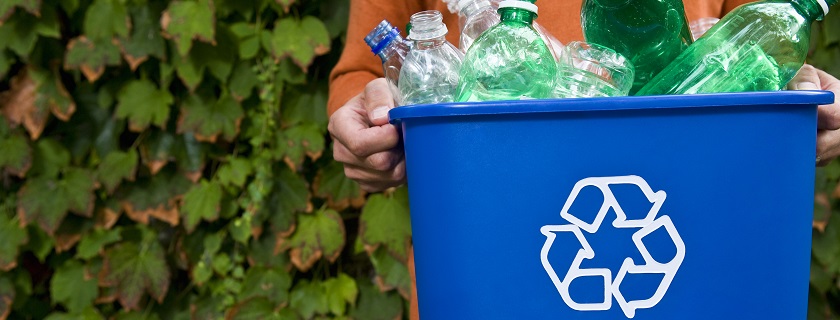 Une femme transporte un bac de recyclage bleu rempli de bouteilles en plastique vides.