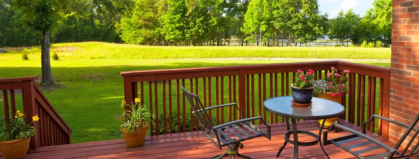 Une table et des chaises sur une terrasse. En arrière-plan des arbres.