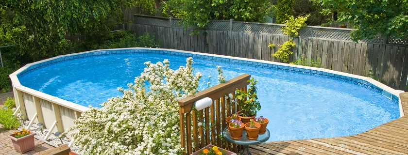 Une piscine avec une terrasse et des arbres, entourés d'une clôture.