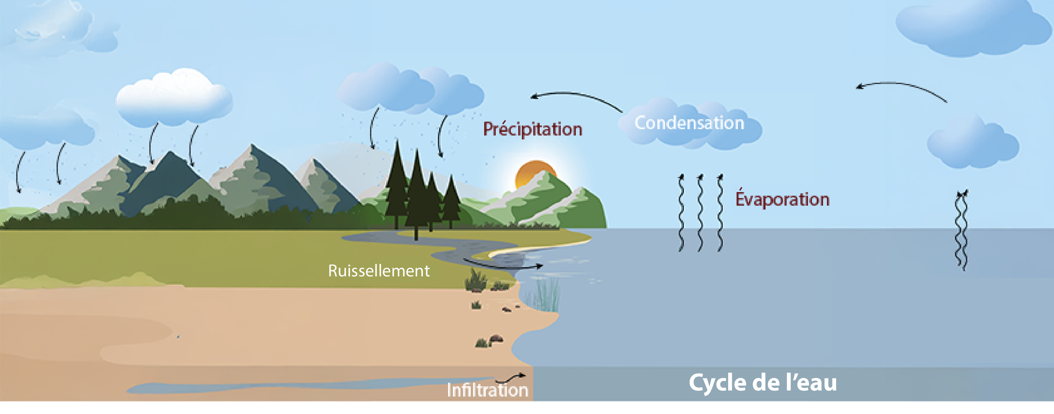 L'eau est un élément environnemental puissant, remodelant constamment la surface de la Terre et permettant à la vie telle que nous la connaissons d'exister (Canada). Bien que le cycle de l'eau soit complexe, les trois processus les plus fondamentaux sont :