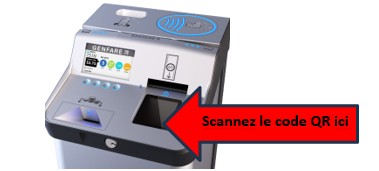R. Assurez-vous de scanner votre téléphone sur la bonne fenêtre du code QR du lecteur de carte (la zone de scan en verre). Le code doit être maintenu stable au-dessus de cette fenêtre pour que le lecteur de carte puisse le lire correctement.
