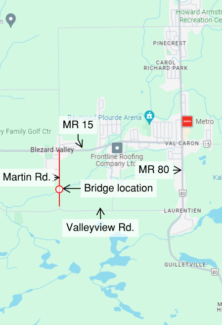 Pour la durée des travaux restants, le pont du chemin Martin sera fermé à toute circulation. L’accès au chemin Martin des deux côtés du pont demeure possible via le chemin Valleyview et la RM 15.