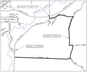 - La circulation sera déviée vers le chemin Finnwoods jusqu’au chemin Moxam Landing, comme l’indique la carte ci dessous. La route restera ouverte en tout temps à la circulation locale et aux véhicules des services d’urgence.