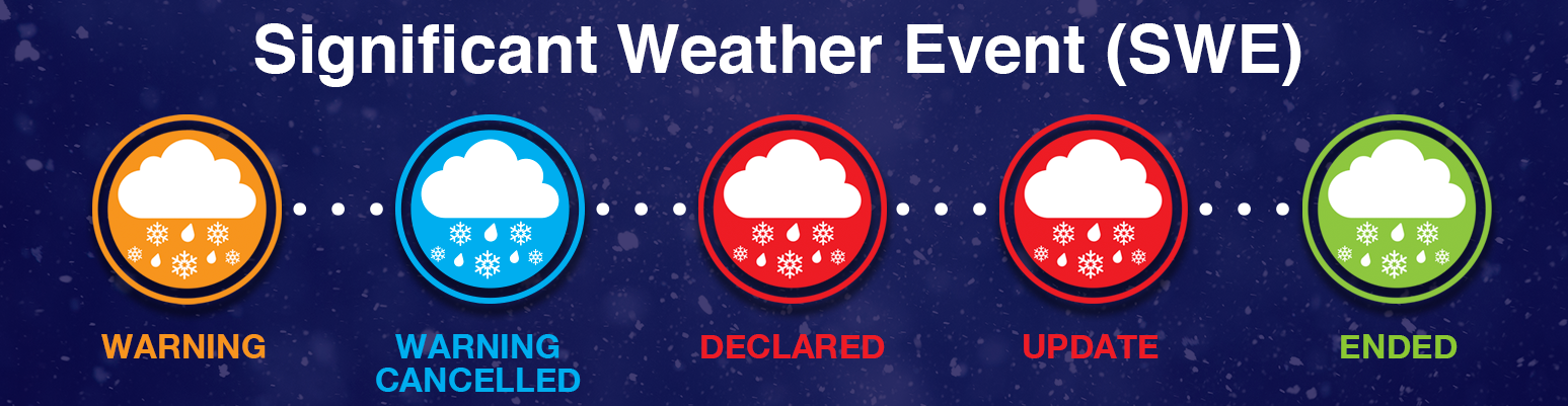 La déclaration d’un PMI n’est pas un avis de réduction des niveaux de service ni un avis de fermeture des routes. Elle a plutôt pour intention d’enjoindre au public de faire preuve de prudence sur les routes et les trottoirs de la municipalité, en raison des conditions météorologiques actuelles, et de l’informer qu’il faudra peut-être à la municipalité un peu plus de temps que d’habitude pour restaurer les routes et les trottoirs à leur état normal.