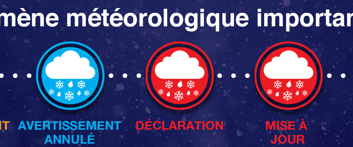 Un « phénomène météorologique important » est défini comme étant un phénomène météorologique dangereux qui s’approche ou qui est actuellement en cours et qui pourrait poser un grave danger pour les usagers des routes dans une municipalité. C’est Environnement Canada qui détermine si un phénomène météorologique est dangereux, en fonction des critères de publication d’une alerte prévus par le Programme d’alertes météorologiques à la population.