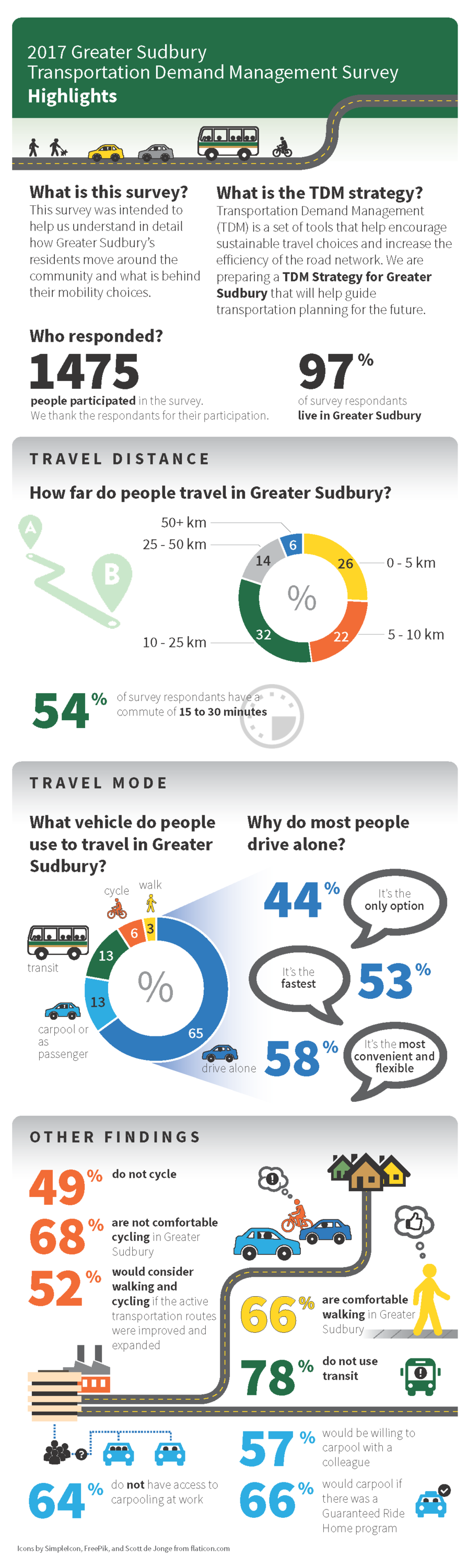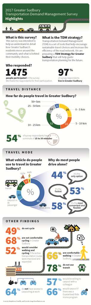 Du 15 mai au 9 juin 2017, nous avons invité les citoyens à remplir un sondage en ligne afin de procurer à la Ville des renseignements qui revêtent énormément d’importance dans l’élaboration du plan de GDT, lequel se concentrera sur les déplacements des gens, plutôt que sur ceux des véhicules, partout dans le Grand Sudbury. Près de 1 500 citoyens ont rempli ce sondage, nous procurant d’excellentes données sur la manière dont les gens se déplacent un peu partout dans la communauté. Cliquez sur le graphique ci-dessous pour voir les points saillants des résultats du sondage sur la GDT.